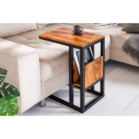 Design asztal laptophoz tárolóhellyel Maliha 45 cm Sheesham Ezzel a praktikus laptoptartó asztallal bárhol kényelmesen dolgozhatsz – legyen szó a kanapéról vagy kedvenc foteledről. Az indusztriális stílusban készült lerakóasztal stabil felületet biztosít