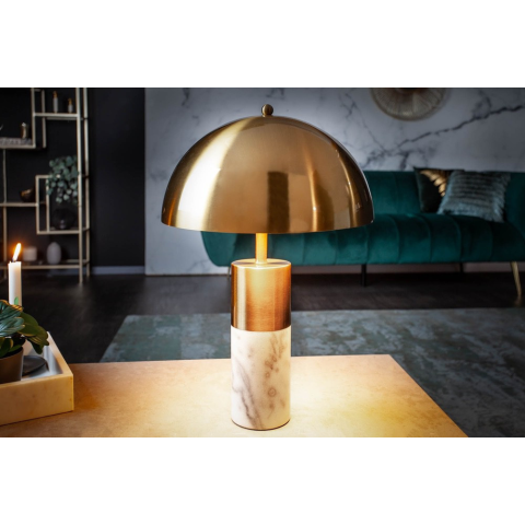 Stílusos Aamira asztali lámpa fehér márvány - arany színben - 52 cm Az Aamira dizájner asztali lámpa elegáns kiegészítője lesz otthonának. Az arany színű kerek lámpabúra minőségi fehér márványból készült alapon nyugszik. A márvány rendkívül egyedi színátm