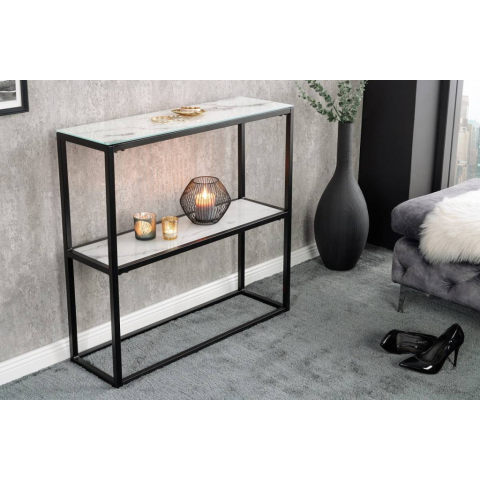 Design konzol Latrisha 80 cm fehér - márvány utánzata A Latrisha konzol már első pillantásra megragadja a tekintetét rendkívüli dizájnjával. A konzol érdekessége a márvány megjelenésű biztonsági üveglap fekete szegéllyel. Számos fehér és szürke márványe
