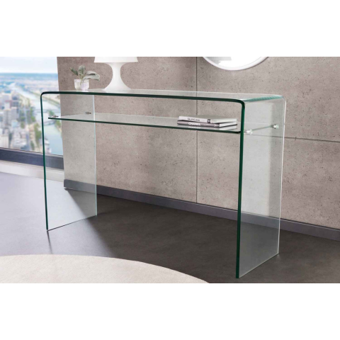 Design konzol Phantom 100 cm üveg A Phantom konzol modern hangulatot kölcsönöz a belső térnek minimalista és időtlen stílusban. Egy darabból készült és azonnal lenyűgöz az ívelt üveglapja, amely nagyon összetett folyamat során magas hőmérsékletre hevítés