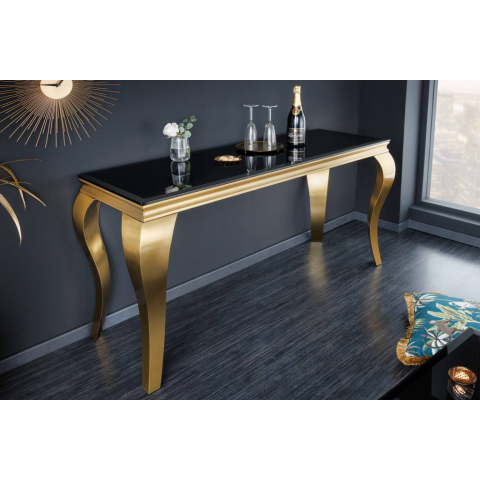 Design konzol Rococo 140 cm fekete / arany A barokk stílusban tervezett Rococo design konzol ívelt vonalaival hívja fel magára a figyelmet. A bájos és modern konzol stílusos ízlésének kifejezője lesz, rendkívüli és összetéveszthetetlen karizmát kölcsönöz