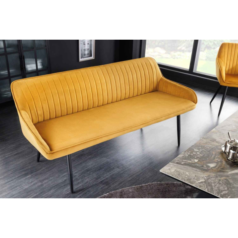 Design ülőpad Esmeralda 160 cm mustársárga bársony Adjon belsőjének egy kis varázst és eleganciát. Az Esmeralda paddal ez egyszerű. Mindenki számára készült, aki stílusosan szeretne pihenni. A bájos bársonyhuzat jellegzetes dekoratív varrással és fém lába