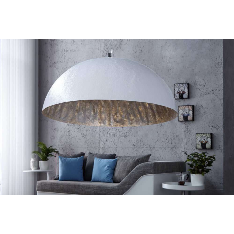 Stílusos lámpa Glimer 70 cm fehér - ezüst Elegáns függőlámpa Glimer fehér színben és ezüst retró belsővel! Egyszerű és speciális - a nemes ezüst belseje szépen tükrözi a fénysugarakat és meleg fényt teremt. Méretek (kb.):Teljes átmérő: 70 cmMagasság: 30