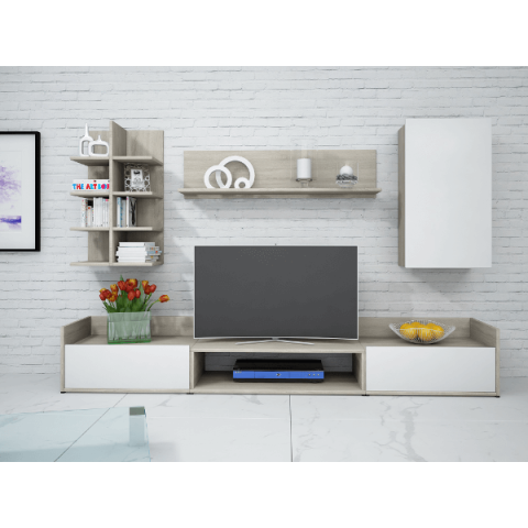 3 fali egység és egy a tv-készülékhez: alsószekrény mérete 30x200x40cm, felső polcos szekrény mérete 70x40x28cm, polc mérete 25x100x20cm, falra szerelhető szekrény mérete 70x40x30cm.