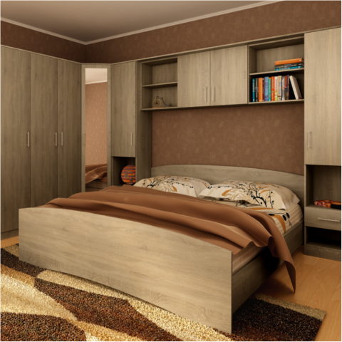 3 ajtós szekrény (felül polc, alul akasztós) 120x200x52 cm. Sarokszekrény polcokkal és tükrös ajtóval 40x200x35 cm. 2 db 1 ajtós, 1 fiókos szekrény, ajtó mögött polcokkal 40x200x35 cm. Ágy (fekvőfelület: 180x200 cm). Áthidaló 187x60x27 cm. Sonoma tölgy dekor. Ágyrács, matrac és dekoráció nélkül!