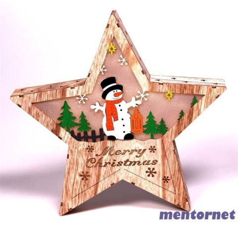 - Anyag: fa - Világítás: LED - Alak: csillag - Minta: hóember - LED szín: meleg fehér - Méret: 30x30cm - Áramforrás: 2xAAA elem