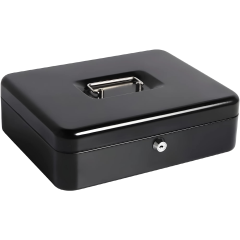 Klasszikus kulcsos pénzkazetta kis méretű értéktárgyak és készpénz biztonságos tárolásához. - Működés: Mechanikus zár, kulccsal nyitható és zárható - Biztonsági kulccsal nyitható, ha szükséges ( A...