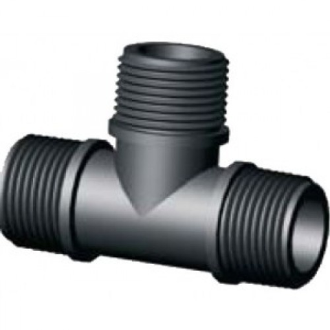 Műanyag menetes T idom, 3/4 külső menetekkel. Széleskörűen felhasználható, akár KPE csővezetékek elosztására, csapok beépítésére. A menetes részeknél mindig használjunk tömítőanyagot. Max nyomás: 10 bar 3/4 külső menet