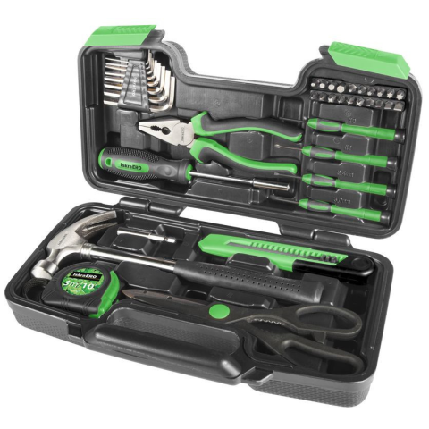• Kombinált fogó: 150 mm (8") • Szeghúzó kalapács: 227g (8 oz) • Tapétavágó kés: 18 mm • Mérőszalag: 3 m x 16 mm • Rozsdamentes acél olló • Imbuszkulcs: 1,5 - 10 mm • Precíziós Csavarhúzó: 2 x Csillag (0,1); 2 x lapos (2,4mm, 3,0mm) • Mágneses fogantyú: 6,35 mm (1/4) • Mágneses toldószár: 60 mm • 25 mm-es Toldalékok (bitek): (20db) • Laposfejű bit (SL): 3, 4, 5, 6 • Csillagfejű bit (PH): 1,2,3 • Pozidriv bit (PZ): 1, 2, 3 • Imbusz bit (M): 3