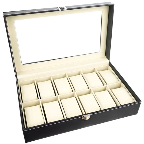 Ékszerdoboz - óratartó doboz, anyaga: bőr, emeletek száma: 1, belső rekeszek 12 óra számára, fekete színű, kulcsos zárral zárható