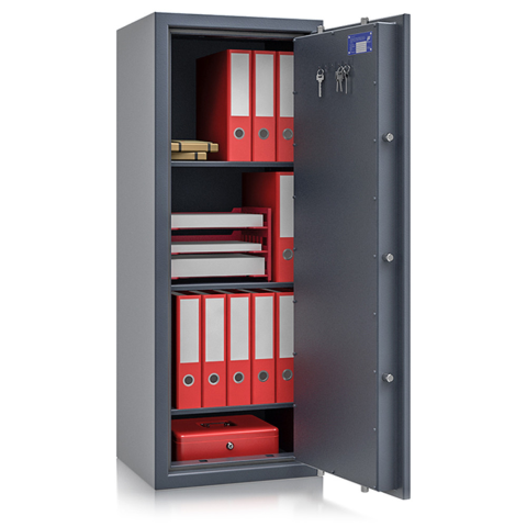 save4ever 8 otthoni páncélszekrény • MSZ EN 1143-1 szerinti EU 1 ellenállási fokozat• 25 mm vastag, többrétegű acél test• 84 mm vastag, többrétegű acél ajtó• 12 mm-re kiálló, ajtóra simuló fém kilincs• 180 fokos ajtónyitás, erős külső zsanérokkal• háro
