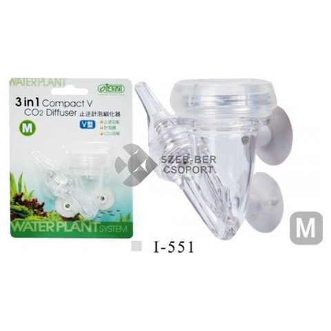 Ista 3 in 1 Compact V CO2 porlasztó (diffúzor). Kifejezetten akváriumi szén-dioxid rendszerhez használatos. Multifunkciós kialakítás, a CO2 beporlasztásán kívül buborékszámlálóként és visszacsapó szelepként is szolgál. Formája által a CO2 cső közvetlenül tud becsatlakozni, nem törik meg. A kerámia porlasztólemez könnyen tisztítható és cserélhető. Tapadókorongjaival rögzíthető az üvegfalon.