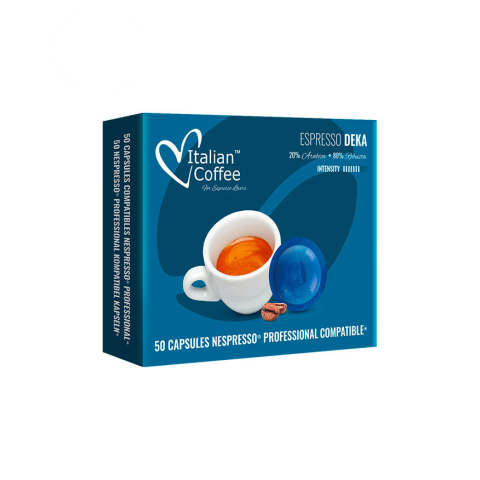 Élvezd a kávézás élményét a nap bármely szakában! Az Italian Coffee Espresso Deka egy intenzív, krémes, koffeinmentes kávé, amely 20% Arabica és 80% Robusta keverékéből készült, Nespresso Professional gépekhez.