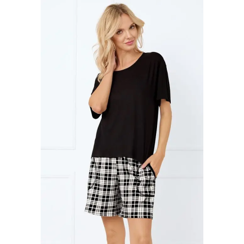 A Klara női pizsama puha viszkózból (felső) és minőségi pamutból készült. A pizsama kétféle anyagból készült, amelyek kiváló minőségűek és finom tapintásúak. A felsőrész viszkózból és elasztánból készült. Fekete színű. A nyakkivágás kerek, az ujjak rövidek. A pizsamaalsó 100%-os pamutból készült. Derekában rugalmas gumi található. Fekete-fehér és kockás mintájú. Kétoldalt zsebes.