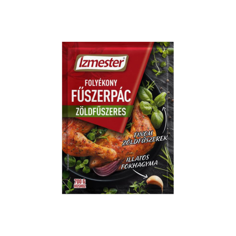 Ízmester folyékony fűszerpác ZÖLDFŰSZERESEgy tasak fűszerpácot 700 gramm hús fűszerezéséhez tud felhasználni.Az Ízmester folyékony fűszerpáccal kényelmesen ízesítheti a húsokat, folyékony állagának kös
