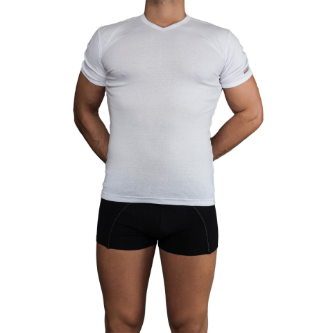 Alsópóló Férfiaknak V-nyakú Rövid Ujjú B62/001. Színe: fehérViselj az ing alatt J.Press 100% pamut férfi alsó-pólót. A V-nyakkivágásnak köszönhetően nem kell végig begombolnod az ing nyakát, akkor sem fog kilátszódni az alá-öltözeted. 100% pamut anyagának köszönhetően nagyon jól magába szívja a nedvességet. Szabása testhez álló, így hagyományos vagy szűkített fazonú ingek alá is viselhető. Rövid ujjának köszönh