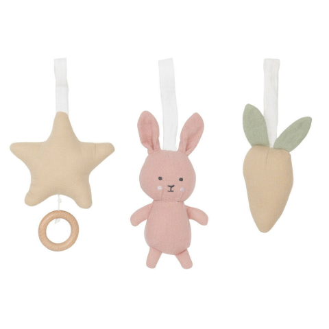 Aranyos babatornáztató figurák textilből a Jabadabado márkától, amelyek egy nyuszit, egy csillagot és egy sárgarépát formáznak. A babatornáztató figurák tépőzárral rögzíthetők az állványhoz, így könnyen mozgathatók és áthelyezhetők. A csillag felhúzható,