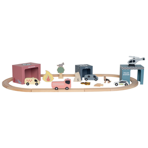 A Jabadabado klasszikus fából készült, járművekkel felszerelt vasúti sínpályája egy rendőrőrsöt, egy tűzoltóállomást és egy börtönt is tartalmaz. Építsd össze a síneket és helyezd el a három házat az út mentén. Az autók áthaladhatnak a rendőrőrsön az épül