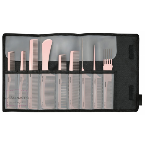HAJFÉSŰ SZETT JAGUAR A-LINE ROSE 9 különböző fésűmodellt tartalmaz praktikus tartóban. Antisztatikusak, és így megakadályozzák a haj töltését. A professzionális, antisztatikus fésűk kiváló minőségű műanyagból készülnek. Minden fésűmodell ellenáll a hő