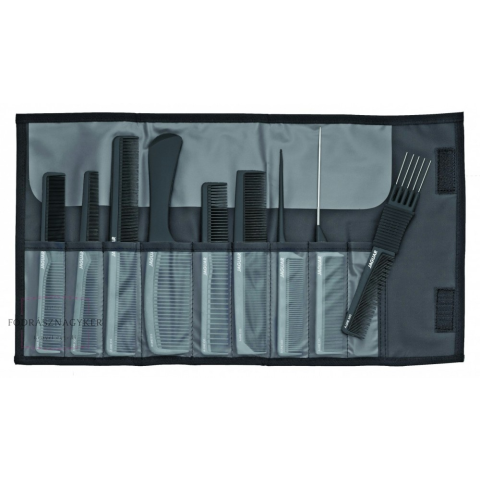 HAJFÉSŰ SZETT JAGUAR A-LINE BLACK 9 különböző fésűmodellt tartalmaz praktikus tartóban. Antisztatikusak, és így megakadályozzák a haj töltését. A professzionális, antisztatikus fésűk kiváló minőségű műanyagból készülnek. Minden fésűmodell ellenáll a h