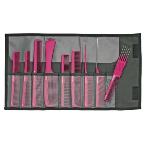 A Jaguar 9 Darabos Rózsaszín Fésű Szett Ionikus Technológiával ideális választás a hajápoláshoz és különböző frizurák elkészítéséhez. A fésűk hőállóak, antisztatikusak és antibakteriálisak, így védik a hajat és a fejbőrt.. Jellemzői:. Ionikus technológia a ragyogó hajért.. Antisztatikus és antibakteriális védelem.. Hőálló, így hajformázó eszközökkel is használható.. Lekerekített fogak a fejbőr védelméért.. Különféle fésűk minden stílush
