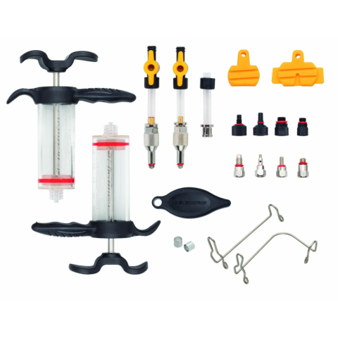 A prémium fecskendők nagyobb tisztaságot, jobb tartósságot és ergonomikus fogantyúkat kínálnak. Az innovatív 1/4 fordulatos szelepek megkönnyítik a légtelenítő rendszer gyors nyitását és bezárását. Az egyenes és 90 fokos kapcsok függőlegesen tartják a fecskendőt, hogy szabadon hagyják a szerelő kezét. A legnépszerűbb 2 és 4 dugattyús féknyereg légtelenítő blokkjait tartalmazza. A Deluxe tok szervezetten és védve tartja a kis alkatrészeket. Tartalmaz prémi