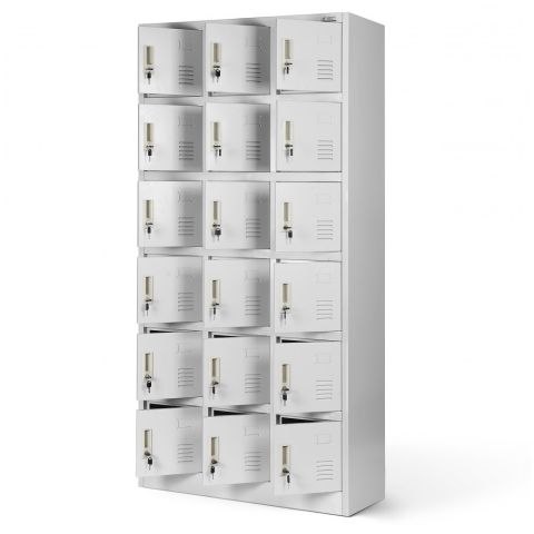 JAN NOWAK KAROL 18 Rekesz, 18 Ajtós Öltözőszekrény vagy Értékmegörző Szekrény Talapzattal 900x1850x400, Világos Szürke Színben A JAN NOWAK KAROL öltözőszekrény ideális választás irodák, iskolák, sportlétesítmények vagy gyárak számára, ahol a biztonságos t