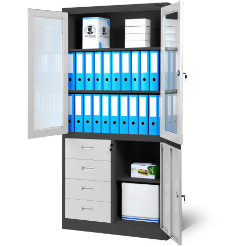 5 kép Jan Nowak® | WIOLA fém iratszekrény vitrinnel és fiókokkal / FEHÉR ANTRACIT