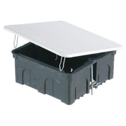 Gipszkarton doboz patt.fedéllel, fém fül, 100x100x50mm IP30. Stabil tartás, széles perem, pattintható fedéllel, fém füllel. Védettség IP30 Méret 100x100x50mm Szín fekete