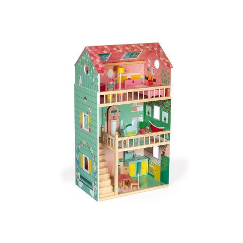 Janod 06580 három emeletes fából készült babaház 12 bútorral 30 cm-es belmagassággal, akár Barbie babának is. Janod gyerekjáték készítő Franciaországból alkotta ezt a nagyszerű, színes, berendezett, hatalmas babaházat fából. Ez