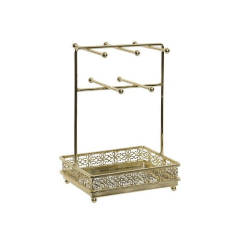 Aranyozott fém ékszertartó állvány, tükrös tálcával kiemelkedően elegáns és stílusos, így tökéletes kiegészítője lehet hálószobádnak vagy öltöződnek. Mérete: 16,5x11,5x24 cm Az állvány alapján egy fényes, aranyozott fém tartó emelkedik ki, amely különf
