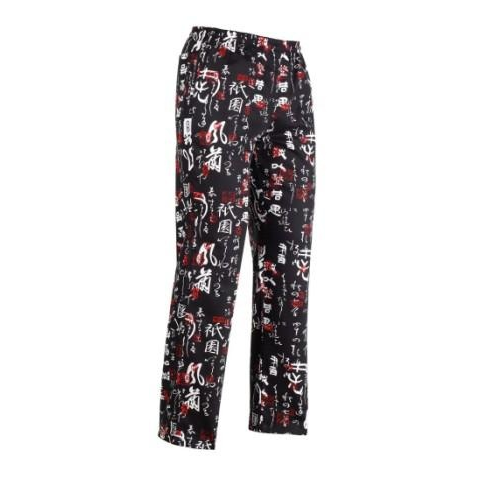 Fekete alapon japán írásjelekkel és motívumokkal díszített szakácsnadrág teljesen gumírozott derékrésszel, megkötővel, két oldalsó és egy hátsó zsebbel. Anyaga: 100% pamut Méretek: S-XXL A feltüntetett árak bruttó árak, amik már tartalmazzák az ÁFA ért