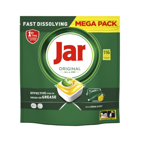 A Jar Original all-in-one mosogatógép tabletta már az első mosogatás alkalmával hatékonyan elbánik még a rászáradt zsíros szennyeződésekkel is, és ragyogóan tiszta edényeket hagy maga után. A Jar egyetlen kapszulában ötvözi a folyékony és a por állagú mos