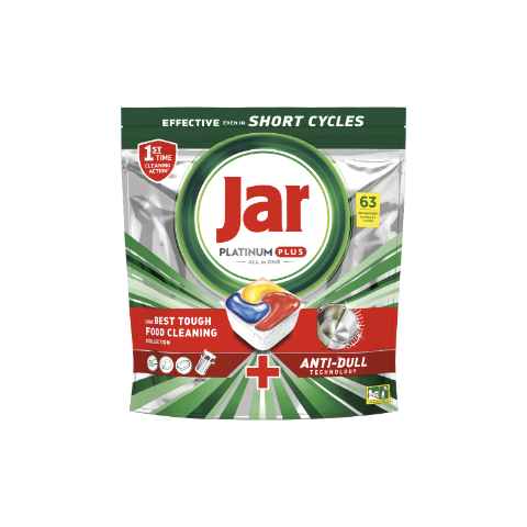 MOSOGATÓGÉP TABLETTA 63 DB/DOBOZ JAR PLATINUM PLUS LEMON A Jar Platinum Plus all-in-one mosogatókapszula a megújulás erejével tisztítja meg az edényeket, és a Jar makacs ételszennyeződések elleni legkiválóbb megoldását nyújtja. Még az idővel képződött