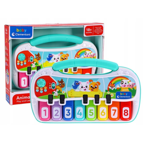 Animals, Állatos zongora Clementoni Doboz mérete: 29x22 cm Tartalma: - bevezeti a gyerekeket a zene világába - 6 módban 8 hang játszható le, hanggal vagy 3 aranyos állat megszemélyesítésével - 4 híres dallam színkombinációja a hátoldalon - 18 hóna