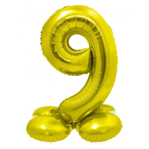 Arany 9-es szám fólia lufi talppal 72 cmFólia léggömb, mely héliummal vagy levegővel tölthető. A lufi önzárószeleppel van ellátva, amely megakadályozza a gáz elszökését.Anyaga: fóliaMéret: 72 cm A lufi tartó