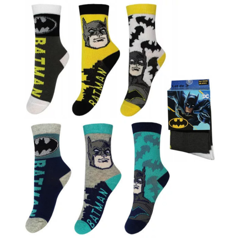 Batman Gyerek zokni 23-34Anyaga: 62% pamut, 23% poliészter, 13% poliamid , 2% elasztán.6 féle minta!Az ár 3 pár zoknira vonatkozik!Méretek : 23/2627/3031/346*3 pár/csomag