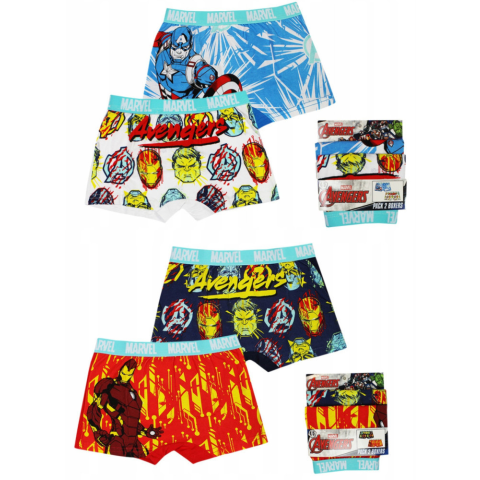 Avengers, Bosszúállók gyerek boxeralsó 2 darab/csomag Az ár 2 darabra vonatkozik! Anyaga: 95% pamut + 5% elasztán Méretek: 4/5 év 6/8 év 9/10 év 10*2 darab/csomag