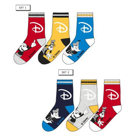 Disney Mickey Gyerek zokni 23-34Anyaga: 62% pamut, 23% poliészter, 13% poliamid , 2% elasztán.6 féle minta!Az ár 3 pár zoknira vonatkozik!Méretek : 23/2627/3031/346*3 pár/csomag