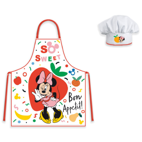 Disney Minnie Gyerek kötény szett Anyaga: 100% poliészter Szett tartalma: - 1 db kötény - 1 db kuktasapka Ajánlott 3-8 éves korig. Csomagolt termék, ajándéknak is kitűnő.