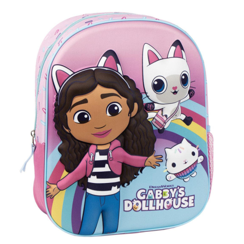 Gabby's Dollhouse, Gabi babaháza 3D hátizsák, táska Méret: 31x27x8 cm Anyaga: 67% poliészter + 33% EVA Egy cipzáras tárolóval rendelkezik, illetve egy oldalsó kis zsebbel.