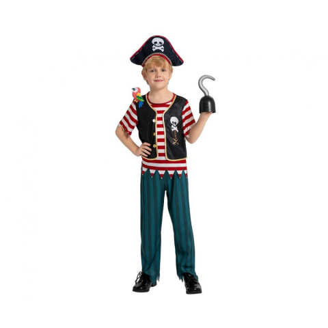 Pirate, Kalóz jelmez Méret: 130/140 cm Tartozékok: - felső - nadrág - sapka - papgáj Anyaga: 100% poliészter