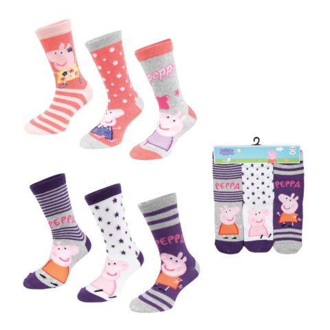 Peppa Pig, Peppa malac gyerek zokni Az ár 3 pár zoknira vonatkozik!Anyaga: 48% pamut + 50% poliészter + 2% elasztán6 féle minta!Méretek: 23/2627/3031/346x3 pár/csomag