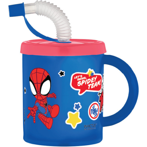 Spiderman, Pókember Spidey szívószálas bögre, műanyag 210 ml Zárható tetővel. Nem mikrózható. Mosogatógépben nem használható. -BPA Mentes -Származási ország: Spanyolország Anyaga: műanyag Űrtartalom: 210 ml