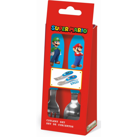 Super Mario fém ergo evőeszköz készlet - 2 darabos Fém kanálból és villából álló készlet, amellyel gyermeke a lekerekített formájuknak köszönhetően szórakoztató és biztonságos módon tanulhatja meg a felnőtt evőeszközök használatát étkezés közben. N