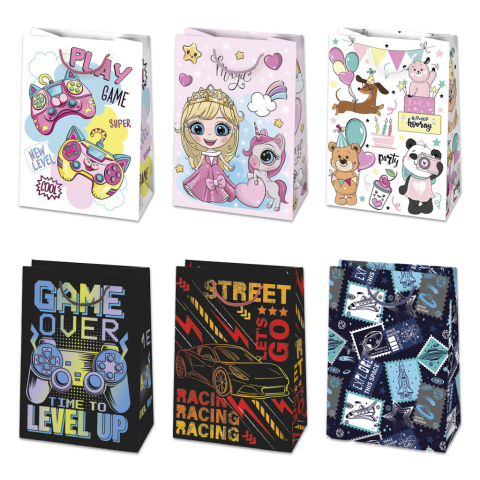 Színes papír ajándéktasak, ajándékzacskó Anyaga: papír Méret: 23x32x11 cm 6 féle minta vegyen! 10 darab/csomag