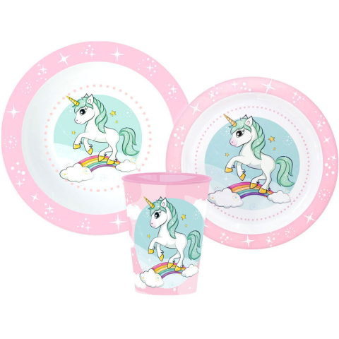 Unicorn, Unikornis Range étkészlet, micro műanyag szett-BPA Mentes-Származási ország: Spanyolország-A termék környezetbarát, újrahasznosítható anyagból készült a Föld védelmében.Csomagolás nélkül!A készlet tartalma:1 db mélytálka (Mikrózható műanyag)1 db lapostányér (Mikrózható műanyag)1 db pohár 260 ml (600 watton mikrózható max. 2 percig)A termék anyaga: műanyag.