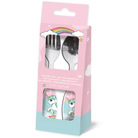 Unicorn, Unikornis fém evőeszköz készlet - 2 darabos Fém kanálból és villából álló készlet, amellyel gyermeke a lekerekített formájuknak köszönhetően szórakoztató és biztonságos módon tanulhatja meg a felnőtt evőeszközök használatát étkezés közben.