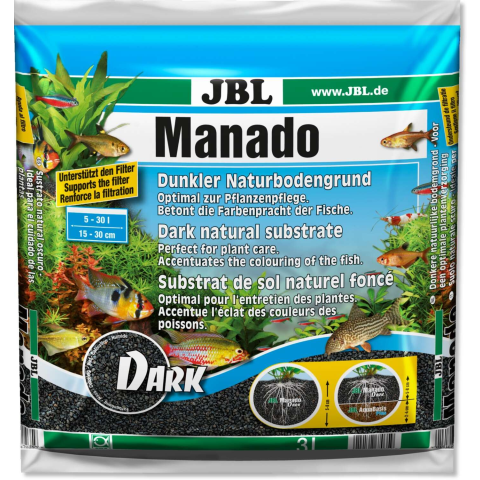 A JBL Manado Dark speciális növényi táptalaj természetes hatású, fekete színű akváriumtalaj, amely aktiválja a talajban zajló károsanyag-lebontó folyamatokat, és optimalizálja a növények tápanyagellátását. Különösen ajánlott garnélás nanoakváriumokhoz. Szemcsemérete 1,5–2,5 mm.