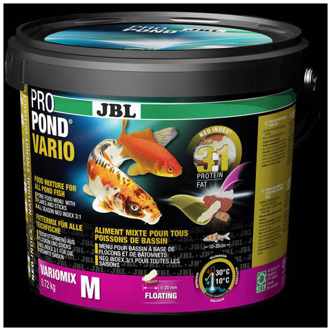 JBL ProPond Vario M - tápkeverék minden tavihal részére (M) 0,72kg/5,5lTeljes értékű takarmány a megfelelő 3:1 fehérje-zsír aránnyal a NEO Index szerint, amely figyelembe veszi a víz hőmérsékletét, funkcióját, állatméretét és életkorátBúzával, gammarusszal, lazaccal, garnélarákkal és hínárral az erős és egészséges tavi halakért (10-30 °C vízhőmérsékleten)M-es etetőméret (5-20 mm) 10-35 cm-es halakhozÚszó rudak és pelyhek 23% fehérje, 7% zsír, 4% n